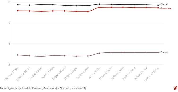 Já em Goiás, os valores são R$5,79 e R$5,86, respectivamente.